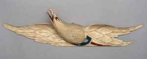 Fig. 13. Eagle past John Haley Bellamy (1836–1914), possibly Portsmouth, New Hampshire, nineteenth century. Wood and paint; height 6 ane/two, width 25 one/2, depth iv inches. "When 1 talks of the crafts as fine art in that location comes to listen . . . John Bellamy . . . [whose work], which is definitely a part of the American craft tradition, is likewise a part of the history of American art, of American creative expression," Cahill declared. "I would non hesitate to identify John Bellamy in the topmost rank of American decorative sculpture in the 19th century." The eagle was illustrated on the comprehend of the Mutual Man catalogue. Colonial Williamsburg Collections, gift of the John D. Rockefeller third Fund, Inc., through the generosity and interest of Mrs. John D. Rockefeller 3rd and members of the family unit.