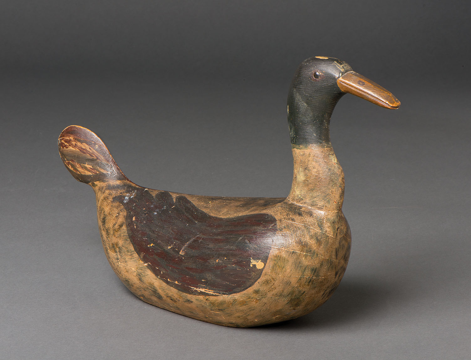 Fig. 3. Loon decoy, American, nineteenth century. Wood and pigment; top xi i/ii, width 17 i/4, depth half-dozen one/8 inches. "Decoys," wrote Cahill, "were made for purely commonsensical purposes, and are particularly interesting as the sculptural expression of the common human. . . . The all-time of the paw-whittled decoys are non so much representations as abstract symbols." Colonial Williamsburg Collections, souvenir of Abby Aldrich Rockefeller.